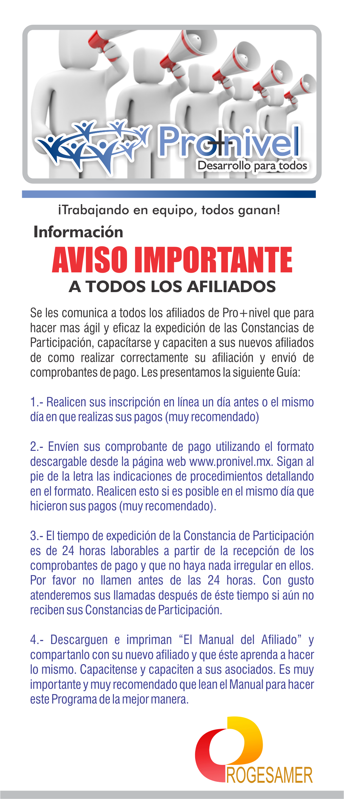PROGESAMER, S. DE R.L. se reserva el derecho de cambiar, modificar, complementar y/o alterar el presente aviso, en cualquier momento, sin previo aviso o en cuyo caso se hará de su conocimiento a través de cualquiera de los medios que establece la legislación en la materia.